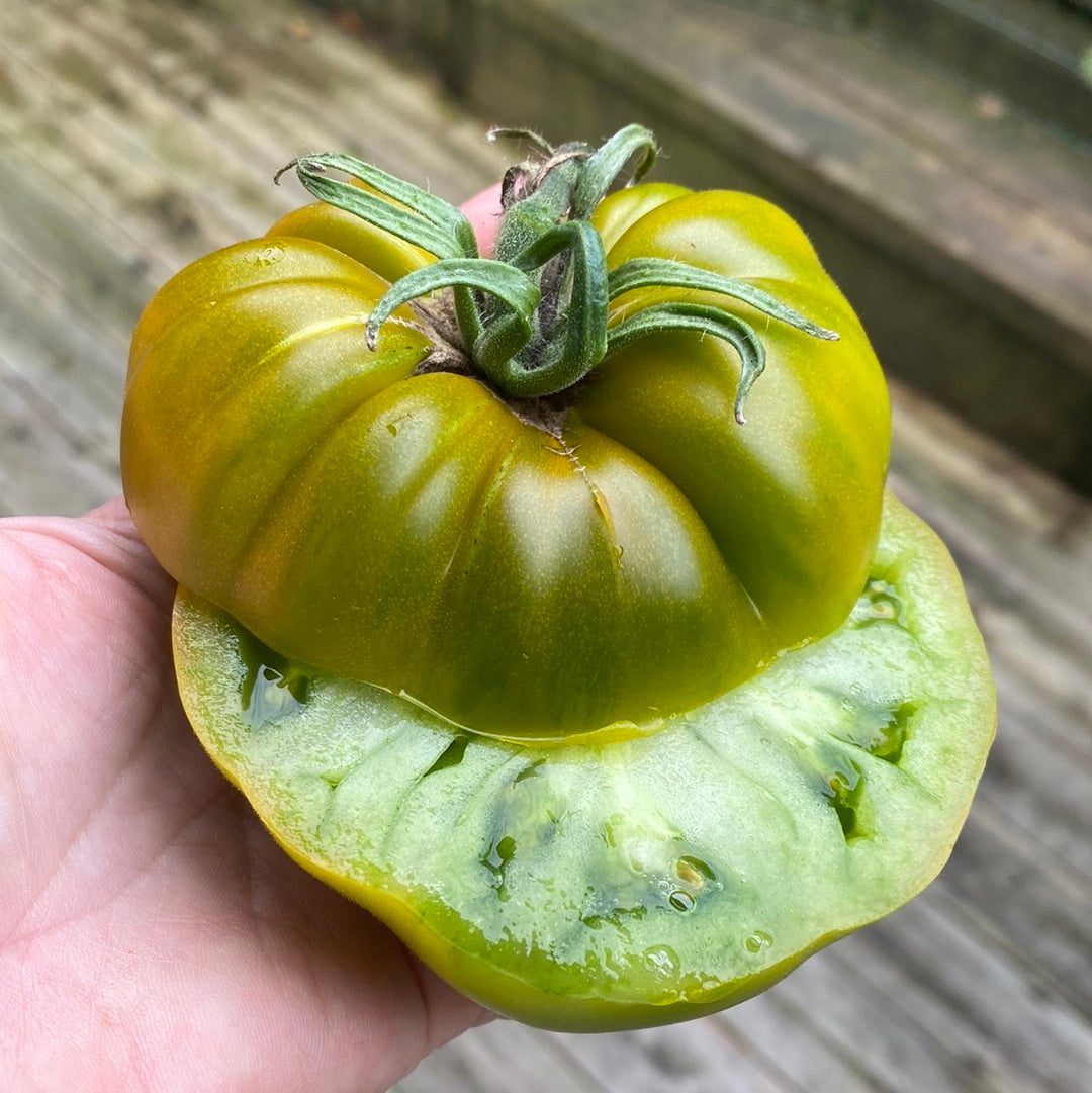 En smakfull tomatsort som skiller seg ut med sine store, grønne frukter som forblir grønne selv når de er modne. Tomatene har en saftig, fast konsistens og en søt, mild smak med et hint av krydder, noe som gjør dem perfekte til salater, burgere og varme retter.