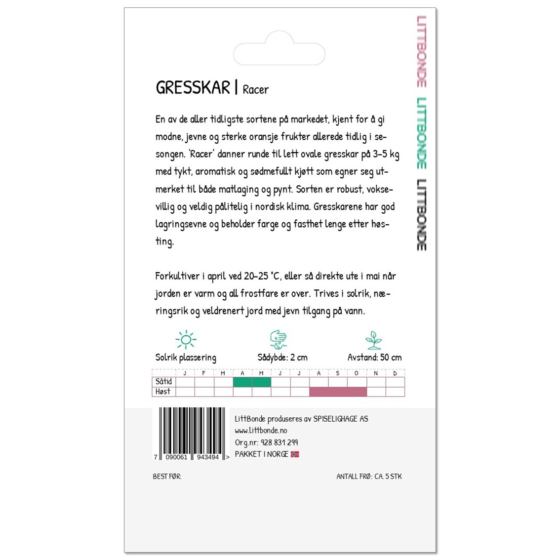 ‘Racer’ danner runde til lett ovale gresskar på 3–5 kg med tykt, aromatisk og sødmefullt kjøtt som egner seg utmerket til både matlaging og pynt. Sorten er robust, voksevillig og veldig pålitelig i nordisk klima. Gresskarene har god lagringsevne og beholder farge og fasthet lenge etter høsting.