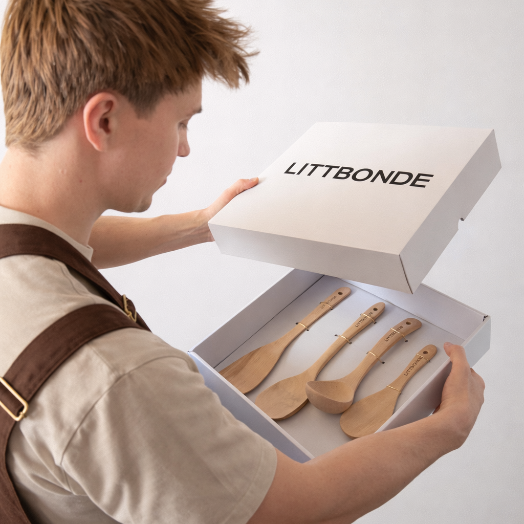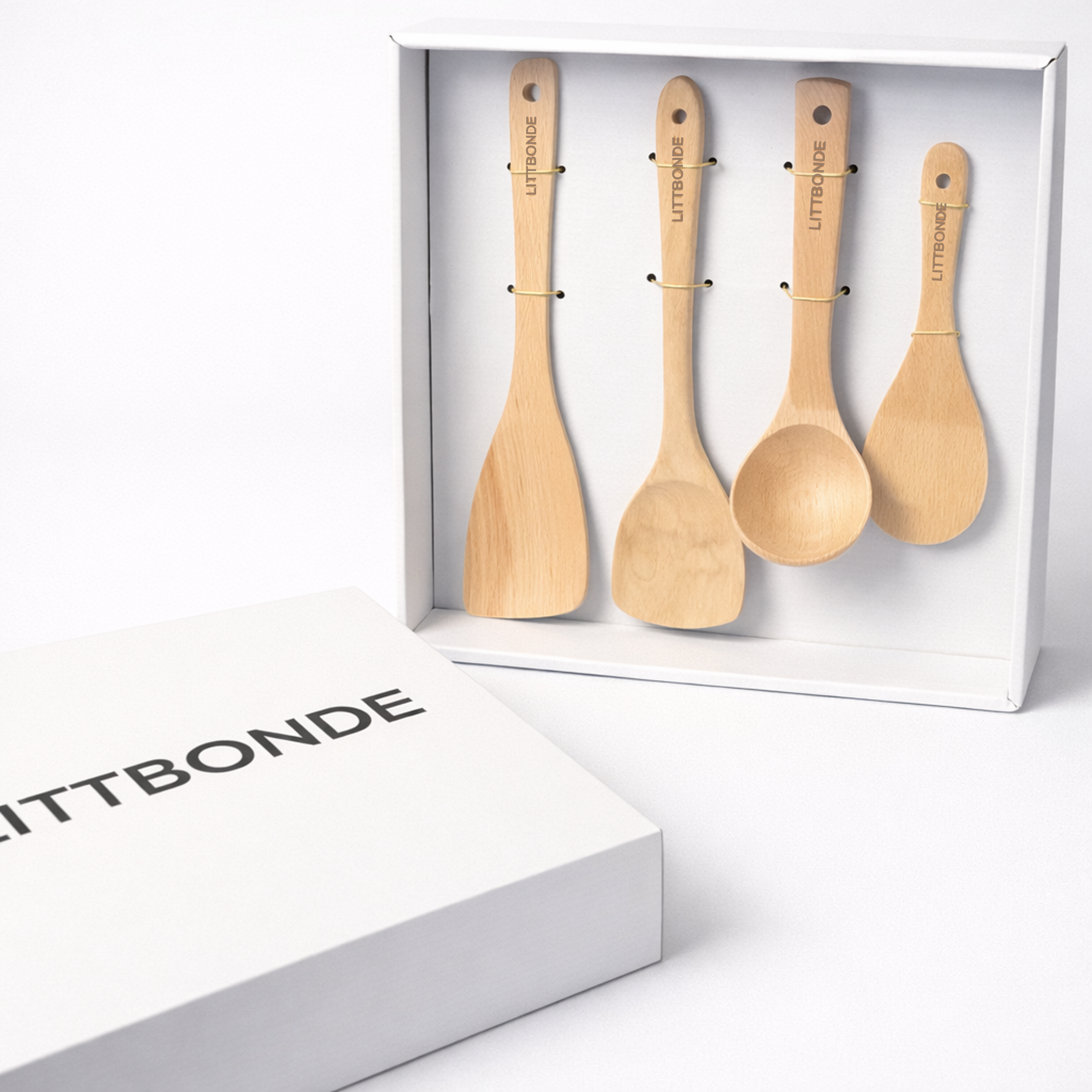 Oppgrader kjøkkenet med et tidløst og naturlig kjøkkenredskapsett fra LITTBONDE®. Dette eksklusive settet består av fire solide kjøkkenredskaper i naturlig treverk, levert i en elegant gaveeske som gjør settet perfekt både til eget kjøkken og som en gjennomført gave til matglade venner og familie. Redskapene er laget i slitesterkt og skånsomt treverk som tåler daglig bruk samtidig som det er trygt for gryter, stekepanner og kokekar med belegg.