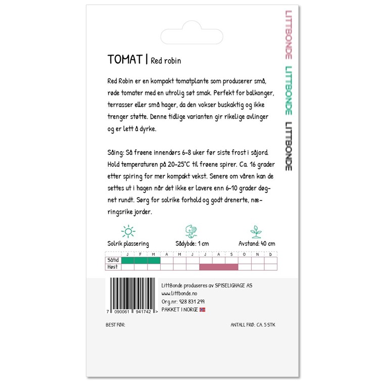 Red Robin er en kompakt tomatplante som produserer små, røde tomater med en utrolig søt smak. Perfekt for balkonger, terrasser eller små hager, da den vokser buskaktig og ikke trenger støtte.